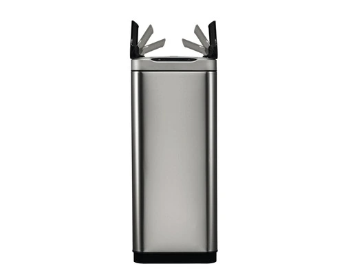 Stijlvolle afvalbak voor afvalscheiding van geborsteld RVS met fingerprint proof coating en 2 kunststof binnenemmers (2 x 20 liter). Het sensormechanisme voorzien van touch switch zorgt ervoor dat de afvalbak zowel d.m.v. een sensor als via de touch knoppen te openen en sluiten is. Door het slanke design uitermate geschikt voor smalle ruimten. Het geruisloos sluitend deksel opent in twee delen waardoor het gemakkelijk onder werkbladen past. De sensor zorgt voor een hygiënisch gebruik van de afvalbak. Door het afneembare deksel is de afvalzak eenvoudig te wisselen. Werkt op 6 AA batterijen (niet inbegrepen).