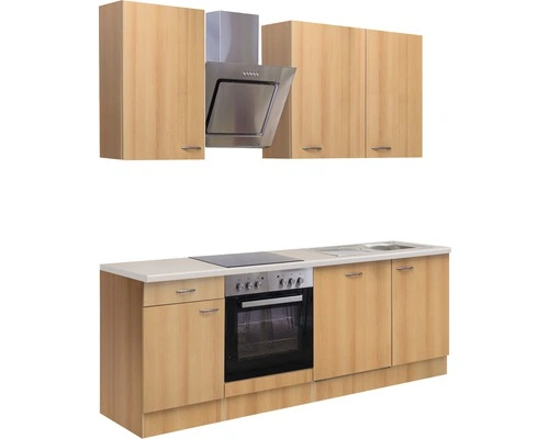 Binnen een ruimte van 220 cm vind je alles wat je nodig hebt om te koken, af te wassen en een goed gevulde voorraad aan te leggen. Met een zuinig inbouwfornuis met roestvrijstalen plint, oven en glaskeramische kookplaat tover je heerlijke gerechten op tafel voor het hele gezin. Een bijzonder staaltje design vormt de krachtige roestvrijstalen afzuigkap, die door zijn speciale vorm tijdens het koken volkomen bewegingsvrijheid biedt. De drie extra grote bovenkasten van 50 c.q. 60 cm breed met elk twee legplanken bieden genoeg plek voor glazen en serviesgoed. De volledig geïntegreerde roestvrijstalen vaatwasser behaalt goede resultaten in de belangrijke functies reiniging en drogen. Een 50 cm brede onderkast met lade en legplank en de 50 cm brede gootsteenkast met roestvrijstalen gootsteen en afdruipgedeelte bieden ook nog extra waardevolle opslagruimte. Om de inrichting van de keuken voor je te vereenvoudigen zijn de kastdeuren zowel voor links- als rechtszijdige montage geschikt.