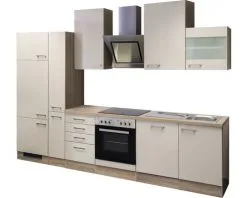 Maar ook de functionaliteit wordt niet verwaarloosd: met een zuinig inbouwfornuis met roestvrijstalen plint, oven en glaskeramische kookplaat kunnen voor het hele gezin bijzondere maaltijden bereid worden. Een bijzonder staaltje van design vormt de krachtige roestvrijstalen afzuigkap, die door zijn speciale vorm tijdens het koken volkomen bewegingsvrijheid biedt. De volledig geïntegreerde roestvrijstalen vaatwasser behaalt de beste resultaten bij de belangrijke functies. In de apparatuurombouwkast bevindt zich een hoog ingebouwde koelkast met 4-sterrenvriesvak. Het 310 cm brede keukenblok Nepal 310 bestaat verder uit twee extra grote bovenkasten van 50 en 100 cm breed met elk twee legplanken, een 50 cm brede bovenkast met glazen deur, een 50 cm brede onderkast met 4 lades in 2 hoogtes, een 60 cm brede hoge kast met koelkastnis en 2 voorraadvakken, een 30 cm brede apothekerskast met 2 lades en 5 legplanken, een 60 cm grote fornuisombouwkast, een 100 cm grote dubbele gootsteenkast inclusief roestvrijstalen gootsteen, afdruipgedeelte, deur en plint voor de vaatwasser een doorlopend werkblad. Om de indeling van de keuken voor je te vereenvoudigen zijn de kastdeuren zowel voor links- als rechtszijdige montage geschikt.