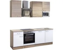 Binnen een ruimte van 220 cm vind je alles wat je nodig hebt om te koken, af te wassen en een goed gevulde voorraad aan te leggen. Met een zuinig inbouwfornuis met roestvrijstalen plint, oven en glaskeramische kookplaat tover je heerlijke gerechten op tafel voor het hele gezin. Een bijzonder staaltje design vormt de krachtige roestvrijstalen afzuigkap, die door zijn speciale vorm tijdens het koken volkomen bewegingsvrijheid biedt. De geïntegreerde 700 W magnetron met 6 standen en een praktische ontdooifunctie is een extra highlight. Twee extra grote bovenkasten van 50 c.q. 60 cm breed met elk twee legplanken en een 50 cm grote bovenkast met legplank bieden genoeg plek voor glazen en serviesgoed. De volledig geïntegreerde roestvrijstalen vaatwasser behaalt goede resultaten in de belangrijke functies reiniging en drogen. Een 50 cm brede onderkast met lade en legplank en de 50 cm brede gootsteenkast met roestvrijstalen gootsteen en afdruipgedeelte bieden ook nog extra waardevolle opslagruimte. Om de indeling van de keuken voor je te vereenvoudigen zijn de kastdeuren zowel voor links- als rechtszijdige montage geschikt.