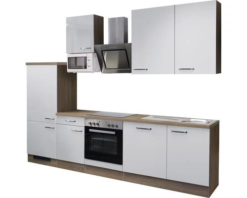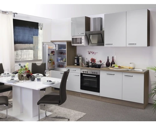 Maar ook de functionaliteit wordt niet verwaarloosd: met een zuinig inbouwfornuis met roestvrijstalen plint, oven en glaskeramische kookplaat kunnen voor het hele gezin bijzondere maaltijden bereid worden. Een bijzonder staaltje van design vormt de krachtige roestvrijstalen afzuigkap, die door zijn speciale vorm tijdens het koken volkomen bewegingsvrijheid biedt. De geïntegreerde 700 W magnetron met 6 standen en een praktische ontdooifunctie is een extra highlight. De volledig geïntegreerde roestvrijstalen vaatwasser behaalt de beste resultaten in de belangrijkste functies. Twee extra grote bovenkasten van 50 en 100 cm breed met elk twee legplanken en een bovenkast van 50 cm breed met legplank bieden genoeg plek voor glazen en serviesgoed. Een 50 cm brede onderkast met een lade en de 50 cm brede gootsteenkast met roestvrijstalen gootsteen en afdruipgedeelte bieden ook nog extra waardevolle opslagruimte. In de 60 cm brede kast bevindt zich een hoog ingebouwde koelkast met 4-sterren vriesvak. Onder de kast is nog genoeg plaats, bijv. voor voorraad en poetsspullen. Om de indeling van de keuken voor je te vereenvoudigen zijn de kastdeuren zowel voor links- als rechtszijdige montage geschikt.