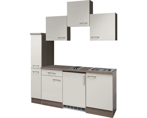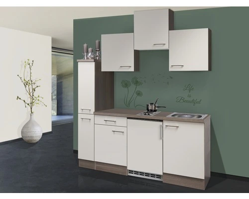 Maar ook de functionaliteit wordt niet verwaarloosd: alles wat in een keuken in principe nodig is, is samengevoegd in een ruimte van 180 cm. Op de tweepitskookplaat met snelkookzones kunnen snel lekkere maaltijden bereid worden en in de 46 cm grote roestvrijstalen gootsteen is ook de afwas geen probleem meer. Onder de kookplaat bevindt zich een energiezuinige onderbouwkoelkast met 3-sterren vriesvak. Bijzonder chic is de apothekerskast met twee lades en in totaal 4 legplanken. Drie 50 cm brede bovenkasten met legplanken en een 50 cm brede onderkast met lade en legplank bieden genoeg opbergruimte voor de kleine huishouding. Ook de 50 cm brede gootsteenkast biedt nog genoeg plek, bijv. voor je poetsspullen. Om de indeling van je keuken voor je te vereenvoudigen zijn de kastdeuren zowel voor links- als rechtszijdige montage geschikt.