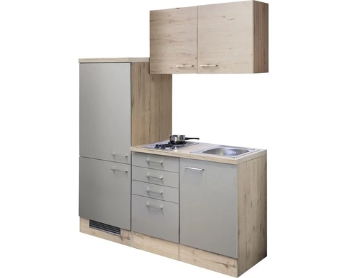 Maar ook de functionaliteit wordt niet verwaarloosd: alles wat in een keuken in principe nodig is, is samengevoegd in een ruimte van 160 cm. Op de tweepitskookplaat met snelkookzones kunnen snel lekkere maaltijden bereid worden en in de 40×50 cm grote roestvrijstalen gootsteen is ook de afwas geen probleem meer. In de kast bevindt zich een hoog ingebouwde koelkast met 4-sterren vriesvak. Een 100 cm brede bovenkast met 2 deuren en legplank en een 50 cm brede onderkast met 4 lades bieden genoeg opbergruimte voor de kleine huishouding. Ook de 50 cm brede gootsteenkast en de kast onder de koelkastnis bieden nog genoeg plek, bijv. voor voorraad en poetsspullen. Om de indeling van de keuken voor je te vereenvoudigen zijn de kastdeuren zowel voor links- als rechtszijdige montage geschikt.