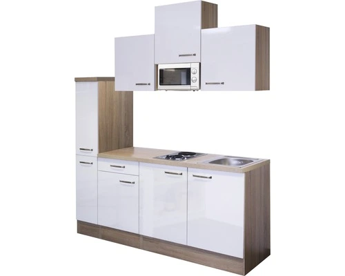 Maar ook de functionaliteit wordt niet verwaarloosd: alles wat in een keuken in principe nodig is, is samengevoegd in een ruimte van 180 cm. Op de tweepitskookplaat met snelkookzones kunnen snel lekkere maaltijden bereid worden en in de 46 cm grote roestvrijstalen gootsteen is ook de afwas geen probleem meer. Bijzonder chic is de apothekerskast met twee lades en in totaal 4 legplanken. Drie 50 cm brede bovenkasten met legplanken en een 50 cm brede onderkast met lade en legplank bieden genoeg opbergruimte voor de kleine huishouding. Ook de 50 cm brede gootsteenkast biedt nog genoeg plek, bijv. voor je poetsspullen. Om de indeling van de keuken voor je te vereenvoudigen zijn de kastdeuren zowel voor links- als rechtszijdige montage geschikt.